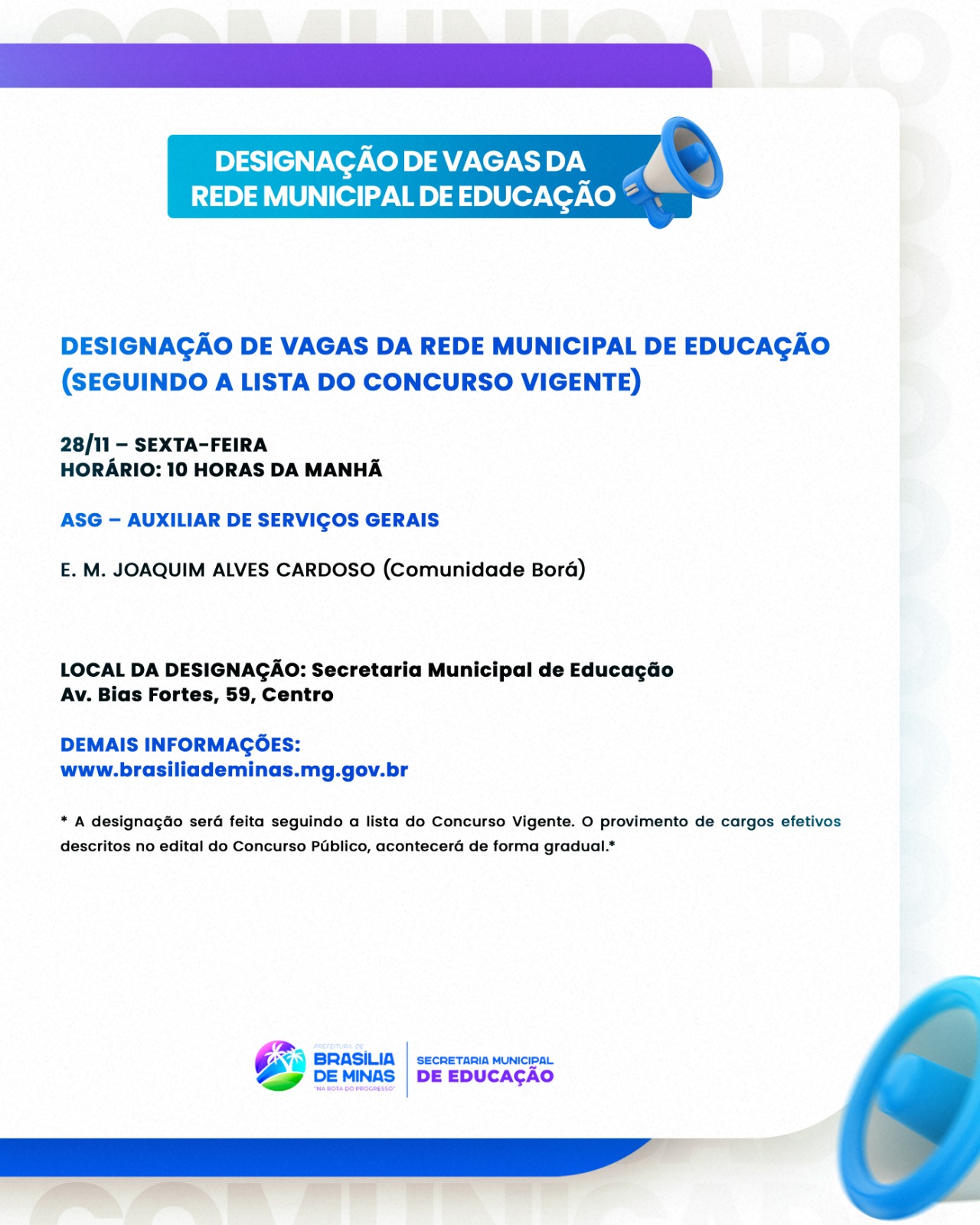 A Prefeitura de Brasília de Minas, por meio da Secretaria Municipal de Educação, informa que haverá designação de uma vaga para Auxiliar de Serviços Gerais – ASG. A designação vai acontecer amanhã, sexta-feira, 28. Sendo, às 10 horas da manhã na Secretaria Municipal de Educação, que fica na avenida Bias Fortes, 59, Centro. Vale ressaltar…