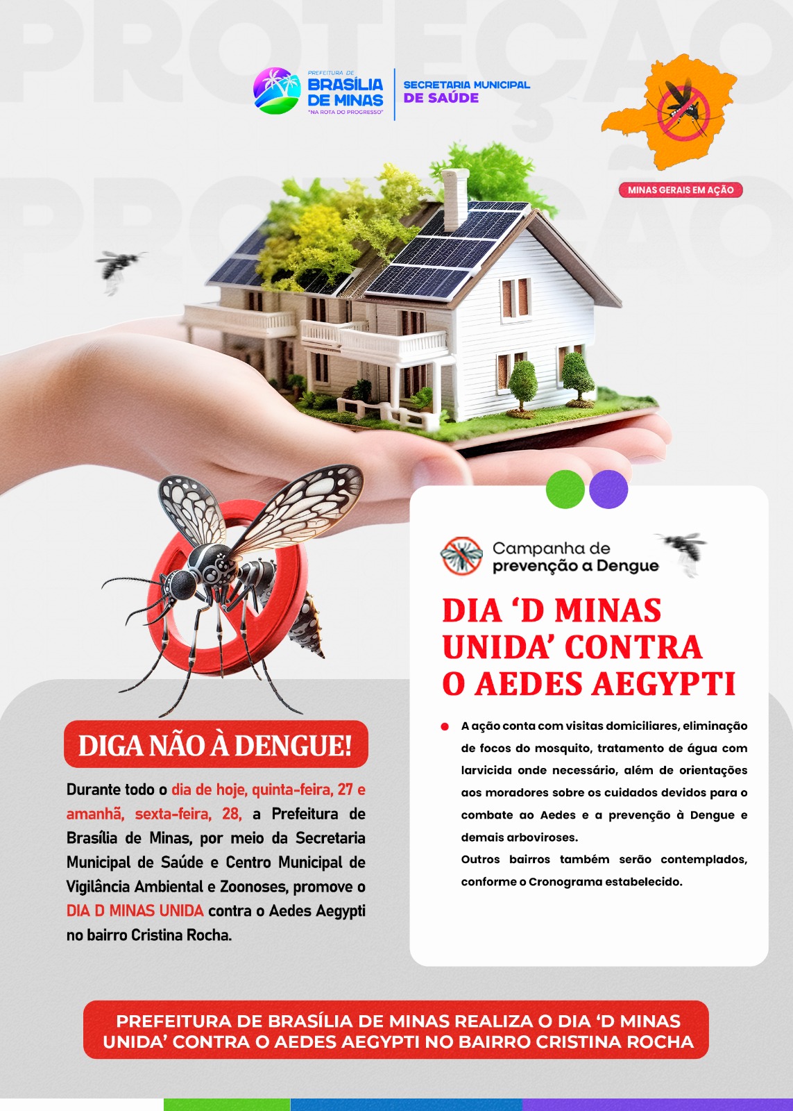 Durante todo o dia de hoje, quinta-feira, 27 e amanhã, sexta-feira, 28, a Prefeitura de Brasília de Minas, por meio da Secretaria Municipal de Saúde e Centro Municipal de Vigilância Ambiental e Zoonoses, promove o DIA D MINAS UNIDA contra o Aedes Aegypti no bairro Cristina Rocha. A ação conta com visitas domiciliares, eliminação de…