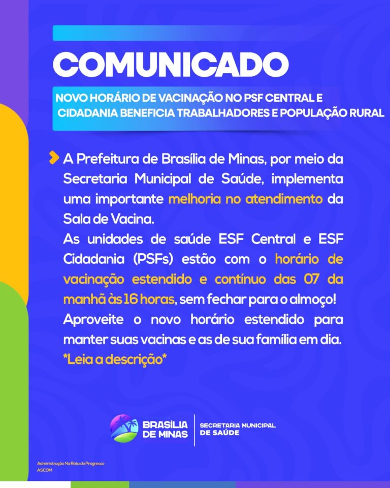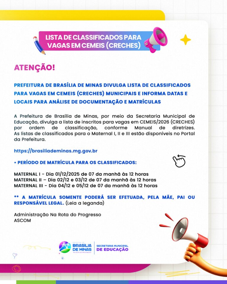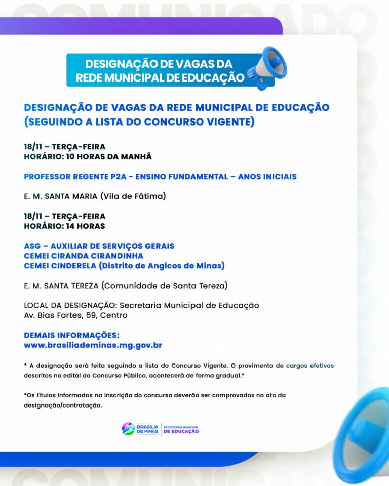 A Prefeitura de Brasília de Minas, por meio da Secretaria Municipal de Educação, informa que haverá designação de vagas para Professor Regente P2A (Ensino Fundamental anos iniciais) e Auxiliar de Serviços Gerais – ASG. A designação vai acontecer amanhã, terça-feira,…