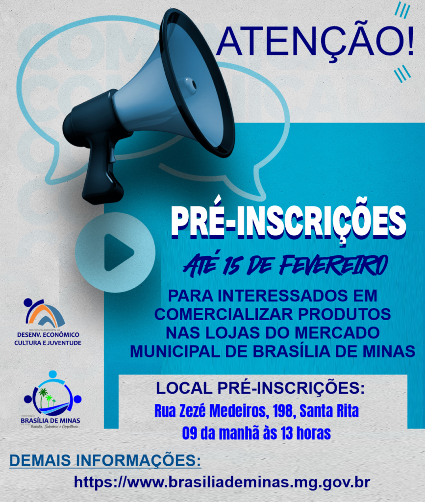 A Prefeitura de Brasília de Minas informa que até o dia 15 de fevereiro estão abertas as pré-inscrições para os interessados em comercializar produtos no Mercado Municipal Deocleciano Soares Alves (Diozão).
